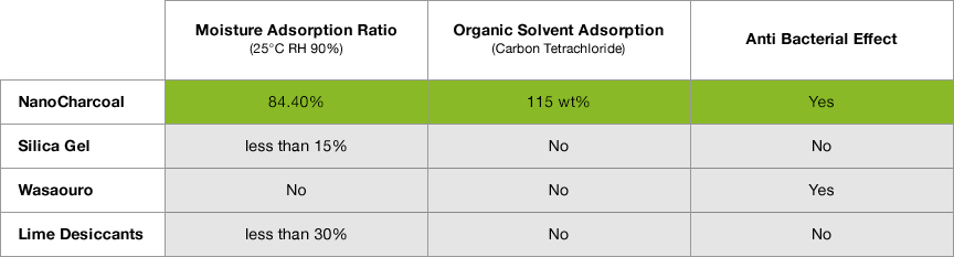 Nano Charcoal has a moisture adsorption ratio of 84.4%, which is the highest moisture adsorption ratio on the market – 5.5 times higher than Silica Gel and 3 times higher than Lime Desiccants.